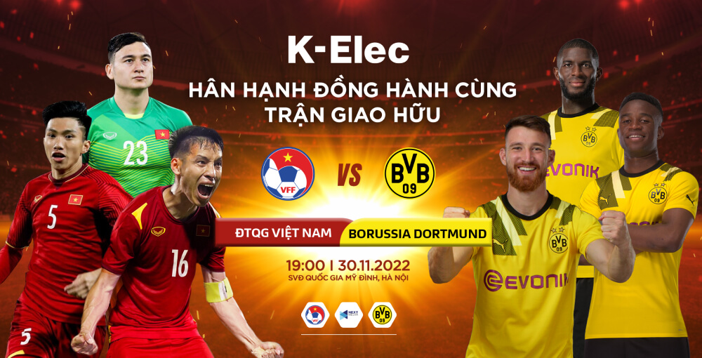 Sau V-League và giải bóng đá Vô địch U17 Quốc gia 2022, sắp tới K-Elec sẽ tiếp tục đồng hành cùng trận đấu giao hữu quốc tế giữa ĐTQG Việt Nam và Borussia Dortmund đang rất được người hâm mộ quan tâm.