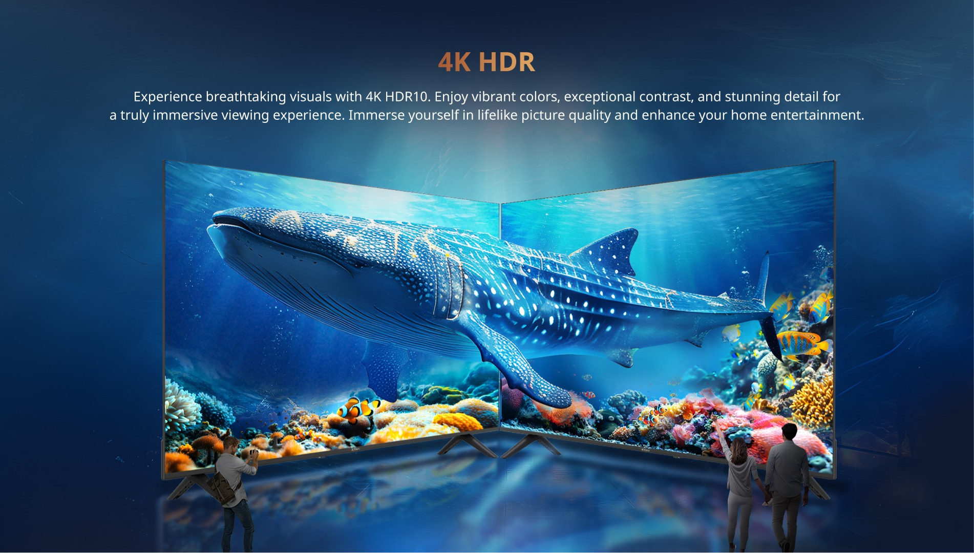 Trải nghiệm hình ảnh ngoạn mục với công nghệ 4K HDR10. Tận hưởng màu sắc sống động, độ tương phản vượt trội và chi tiết sắc nét đến kinh ngạc. Đắm mình trong chất lượng hình ảnh chân thực như cuộc sống, nâng tầm không gian giải trí tại gia của bạn.